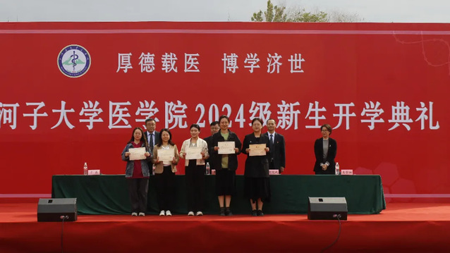 接下来,学院领导为23名新生班主任颁发聘书,希望他们在未来的日子里肩负起引导和教育新生的重要职责,以丰富的经验和热情的工作态度,为新生们创造一个温馨、有序且充满活力的学习环境。随后,在左彭湘副院长的带领下,全体2024级医学生庄严地进行集体宣誓。他们紧握拳头,神情肃穆,“健康所系,性命相托”的呐喊响彻操场,“热爱祖国,忠于人民,恪守医德,尊师守纪”的箴言犹在耳旁,“为祖国医药卫生事业的发展和人类身心健康奋斗终生”的初心铭记在心。