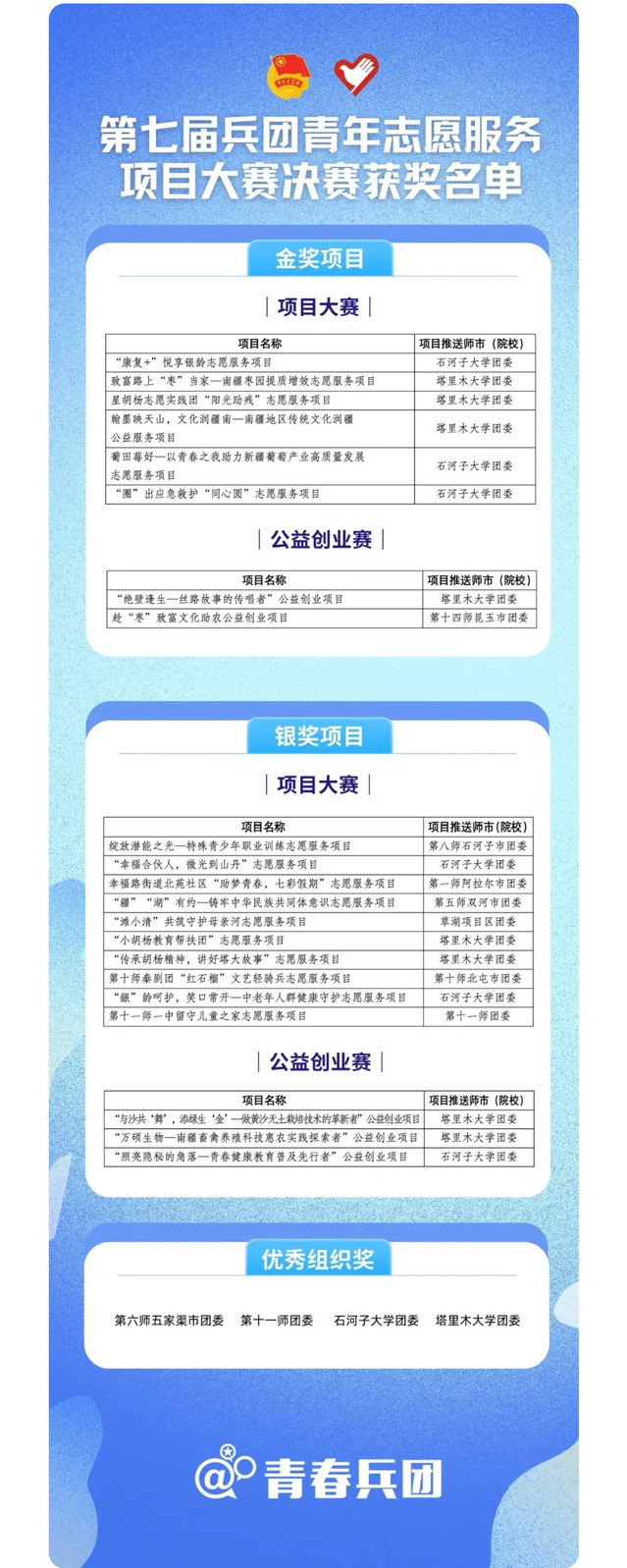 94-5日,第七届兵团青年志愿服务项目大赛决赛暨志愿服务交流会在五家渠市圆满闭幕。我院选送的三个志愿服务项目经过激烈角逐,最终喜获两金一银的优异成绩,展现了我院青年志愿者的卓越风采和专业能力。