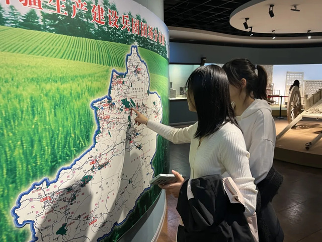 在讲解员的引领下,同学们首先来到博物馆的第五层,探访新疆历史屯垦史馆。这里展现了新疆的历史脉络、屯垦的艰辛历程以及独特的地域风情。馆内珍贵的历史资料,生动再现了兵团波澜壮阔、跌宕起伏开垦边疆的历史场景,让同学们深刻体会到兵团人开拓进取、艰苦奋斗的崇高精神。