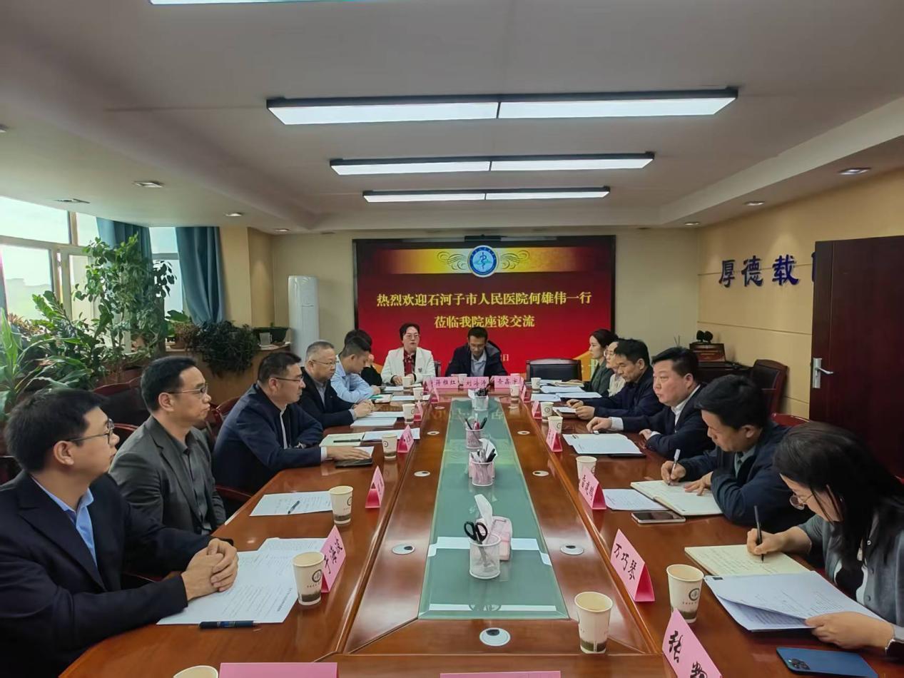 4月22日,八师石河子市人民医院党委副书记、院长何雄伟一行来院调研,云顶集团yd222党委书记张青带领班子成员和各业务科室负责人开展座谈,双方围绕教学科研协同创新、人才培养机制优化、科研能力提升等核心议题展开深入交流。