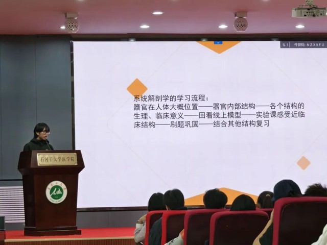 口腔医学专业的唐凯同学以系统解剖学为核心展开分享。他提出“课堂(80%)+自学(20%)”的黄金学习配比,强调课堂专注力的重要性;同时独创“联动记忆法”,通过简化图谱、手绘结构简笔画搭建知识框架,让复杂的解剖构造在视觉化呈现中变得清晰可辨,为学子们锚定了系统解剖学的学习方向。