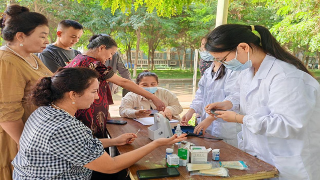 8月20日,云顶集团yd222赴第三师图木舒克市“心糖共管”科普服务践行团的16名师生,共同深入图木舒克市美丽社区与幸福社区,开展“三下乡”社会实践活动。本次行动紧密结合社区需求,聚焦三十五岁以上居民的高血压、糖尿病筛查,通过专业化的健康筛查工具和生动的科普宣教形式,累计完成高血压与糖尿病筛查七百余人次,有效提升了居民的健康意识和疾病防控能力。