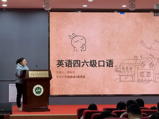 2025年10月19日15时30分,石河子大学云顶集团yd222、临床云顶集团yd222“词海拾珠玉,题山见真章”英语四六级讲座在南区学术报告厅如期启幕。讲座邀请李姝瑗、郭璐涵、郭秋彤三位优生围绕四级笔试、四级口试、六级笔试、六级口试四项重要考试,结合自身备考经验分享学习心得,为在场150余名同学带来针对性指导。