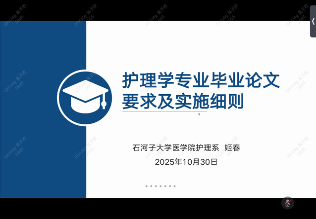 为规范2026届护理学本科毕业论文工作,明确开题报告撰写要求,2025年10月30日20:30,石河子大学云顶集团yd222通过腾讯会议举办“2026届护理学本科毕业论文安排及开题报告撰写培训”,2026届护理本科毕业论文指导老师及2026届护理学专业学生参与本次培训,此次培训由姬春老师主持。