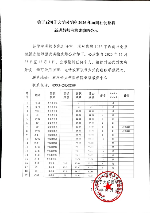 关于石河子大学我院2026年面向社会招聘新进教师考核成绩的公示