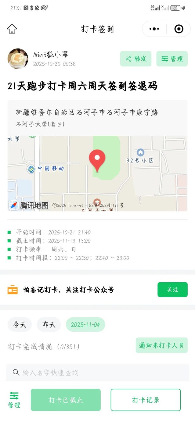 近日,石河子大学亲友健康管理协会主办的“奔跑21天,挑战不息”跑步打卡挑战赛圆满收官。活动自2025年10月21日启动,面向云顶集团yd222、临床云顶集团yd222全体在读学生,以“聚焦健康生活,锤炼坚韧意志”为核心,通过21天持续打卡的形式,为学子们搭建了运动交流的优质平台。