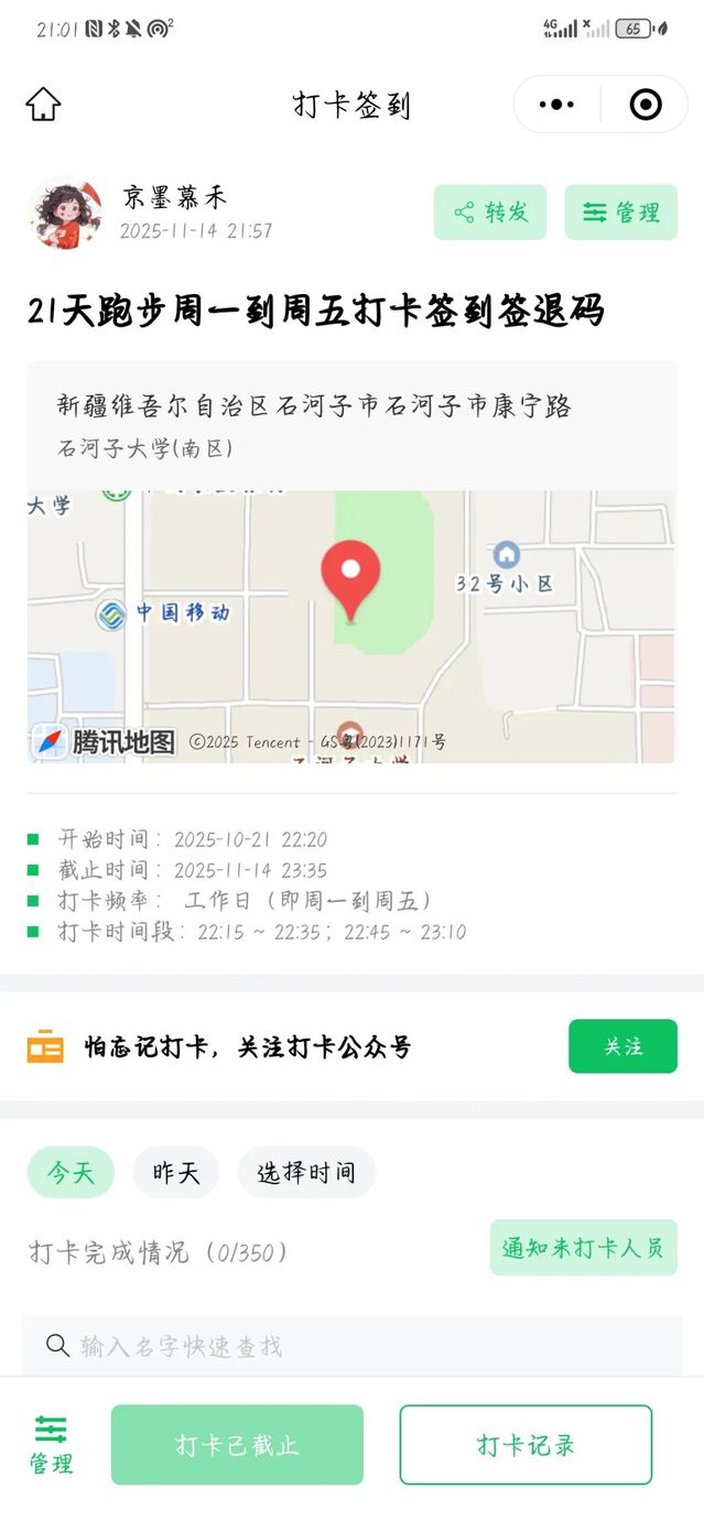 活动创新设置“每周之星”点赞补签机制,区分工作日与周末差异化打卡时段,并依托微信小程序实现便捷签到签退与轨迹核验,充分适配学生作息与参与需求。