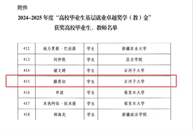 近日,教育部高校学生司联合中国教育发展基金会公布2024-2025年度“高校毕业生基层就业卓越奖学(教)金”获奖名单,我院2019届本科毕业生滕贵权凭借在基层岗位的突出业绩光荣入选。该奖项由教育部高校学生司指导、中国长江三峡集团出资设立,全国仅418名毕业生获此殊荣,滕贵权的获奖既是个人奋斗的勋章,更是我院“扎根基层、服务社会”育人理念的生动彰显。