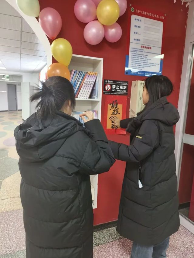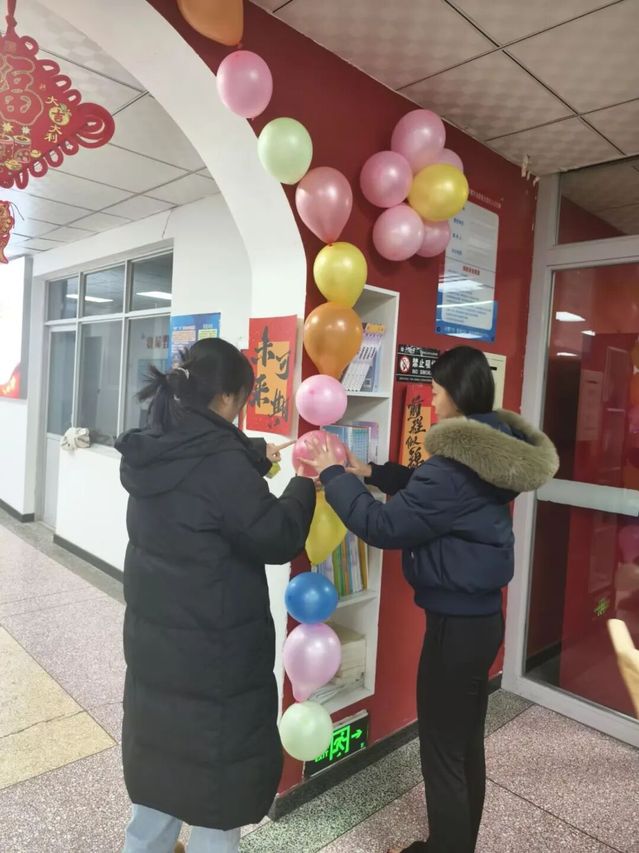 布置过程中,同学们细致分工、默契配合。现场气氛热烈而有序,有的同学负责整理和悬挂象征团圆的灯笼,有的细心张贴寓意吉祥的“福”字拉花和元旦主题装饰画,还有的同学合作吹起并固定缤纷多彩的气球。大家相互协作,将每一样装饰品精心安排在最合适的位置。