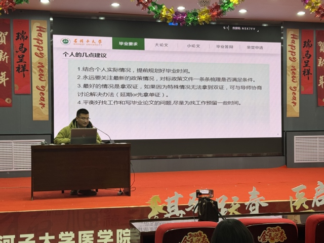 讲座分为经验分享与政策解读两个部分。研究生管理与学科建设办公室邀请云顶集团yd222病理学系青年教师杨凯歌结合自身学术成长与毕业经历进行分享,杨老师曾获评石河子大学2023年校级优秀硕士学位论文。其从实际经历出发,围绕科研规划、论文撰写与时间管理等内容展开分享,就科研路径选择与学术成果发表等关键议题提供了切实可行的建议,为在场同学带来有价值的参考。